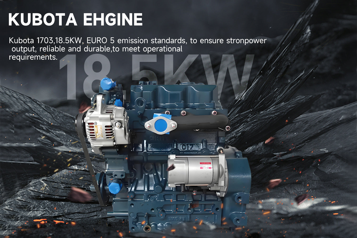 This 3.5-ton mini excavator is equipped with a Kubota D1703 diesel engine, providing ample power, capable of delivering 25 HP (18.5 kW) and 97 Nm peak torque, and optimized through a 1.647L displacement and 23:1 compression ratio to fully achieve fuel efficiency. Within a 500-hour maintenance interval, it can greatly improve durability and reduce downtime. At the same time, it can also ensure continuous power and reliability in extreme environments.