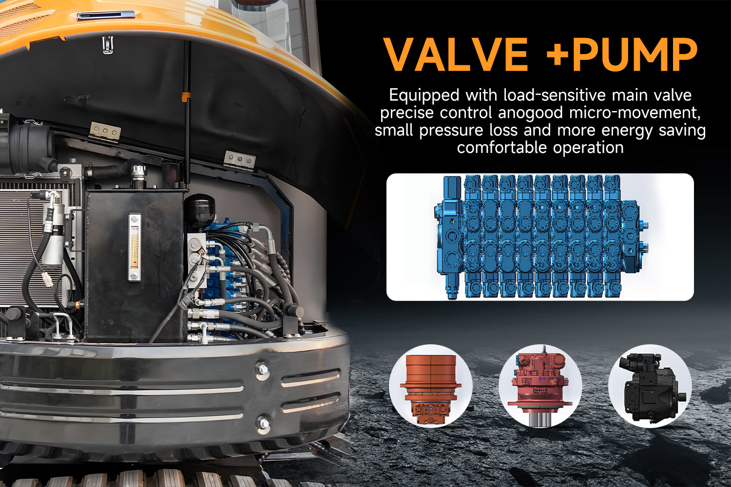 This combination of hydraulic components can effectively improve the machine's performance and efficiency, while the piston pump can provide stable and strong output, and the load-sensing main valve intelligently adjusts the flow and pressure according to working conditions, achieving energy saving and efficiency improvement. Our 3.5-ton mini excavator has these features, which together enhance the machine's power, flexibility, and reliability.