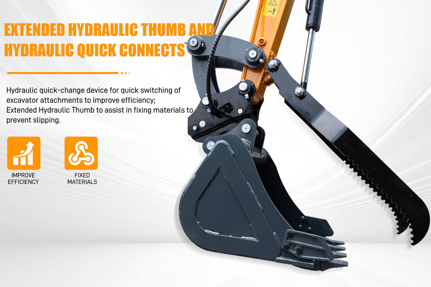 The matched extended hydraulic thumb clamp can enhance the versatility of the mini excavator, while it can grab large or irregular objects, and our hydraulic quick coupler allows you to switch between different attachments in seconds without leaving the cab, perfectly achieving faster, safer, and more efficient operations.