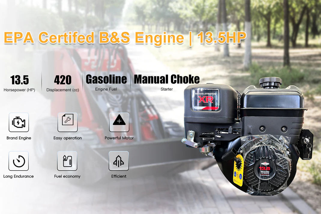 This mini mini skid steer loader is powered by a premium Briggs & Stratton 13.5HP engine powerful yet fuel-efficient operation and superior heat distribution. Bid farewell to grating vibrations, savor flawless functioning, and anticipate its longevity. Longer service life.