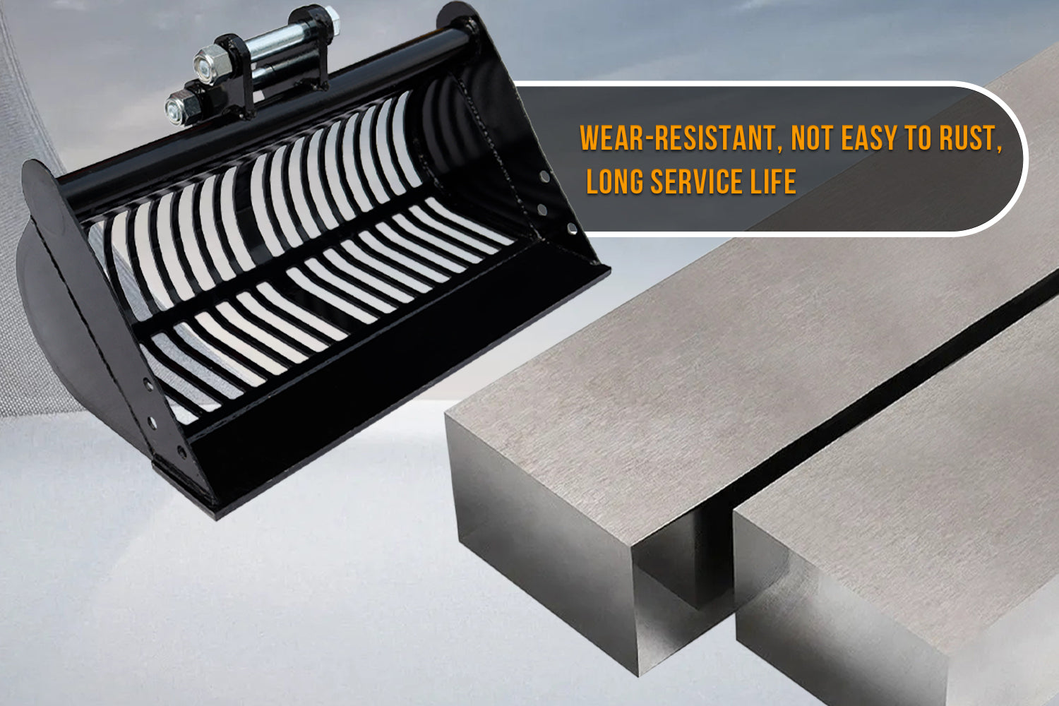This screening sieve bucket attachment is made of manganese steel. Wear resistant and sturdy