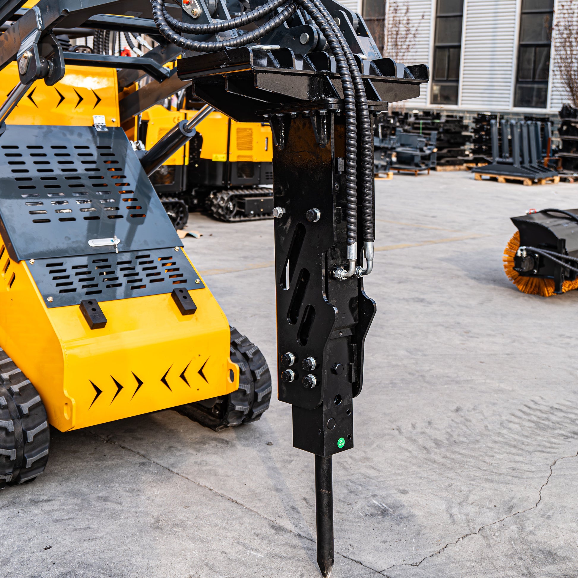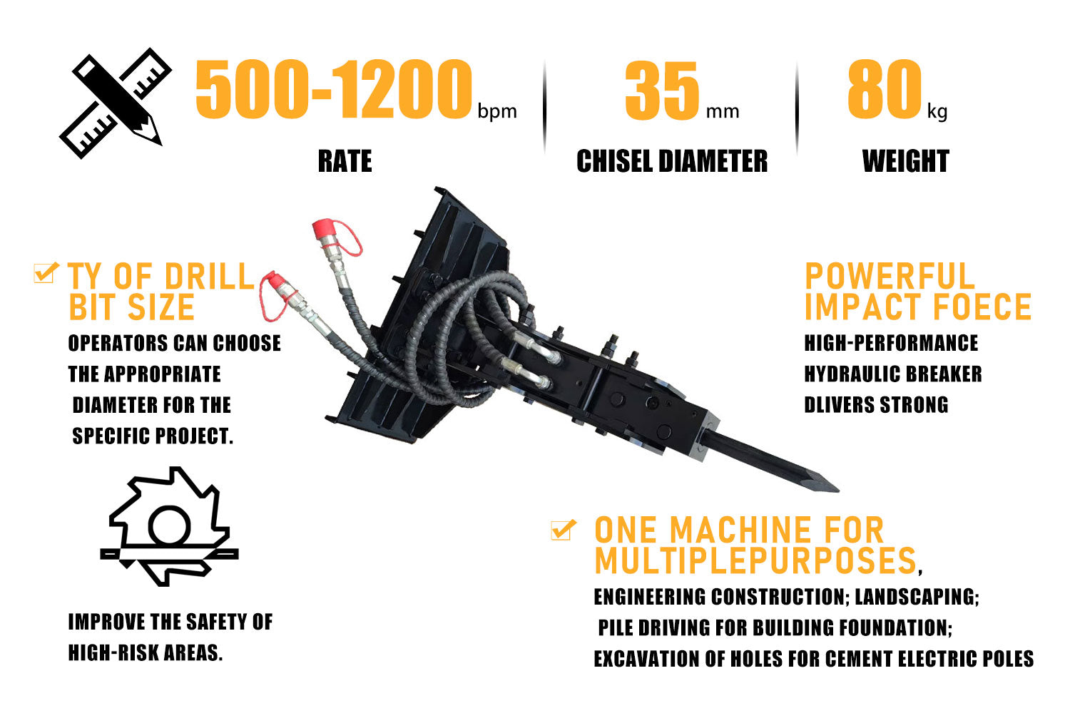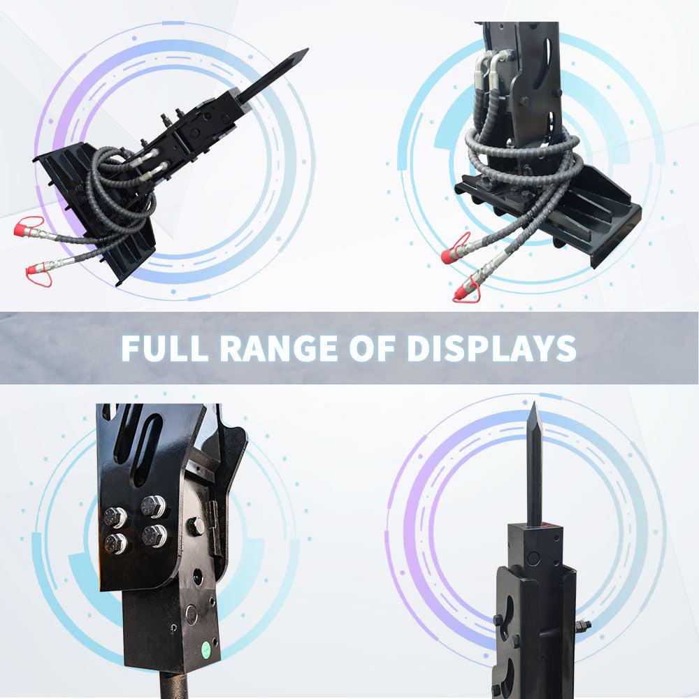 MMS Skid Steer Loader Breaker Hammer, designed with high precision, is equipped with a 35mm/45mm drill pole and a reinforced hose system, mainly used for high-difficulty demolition, concrete breaking, and trenching operations.