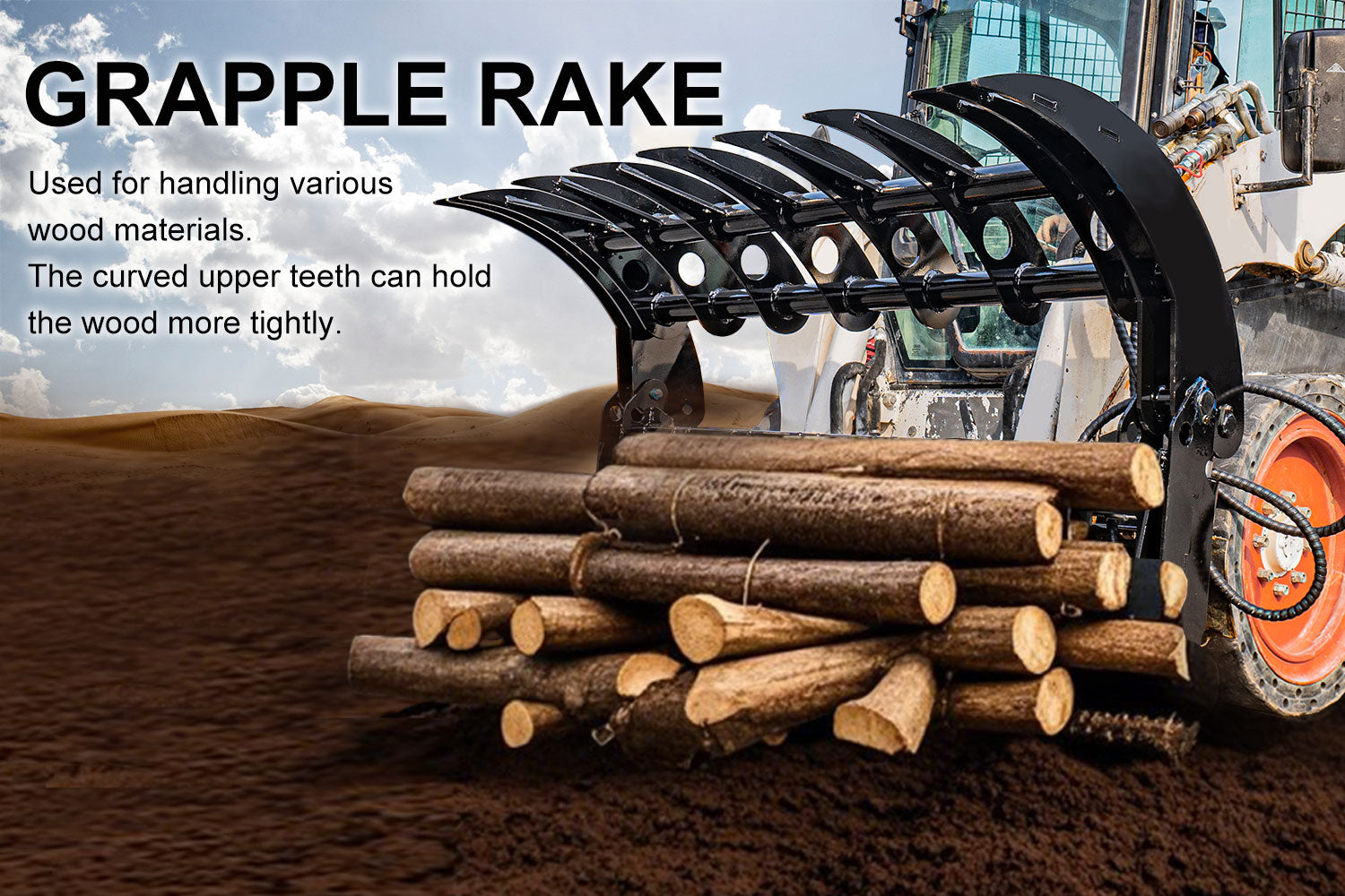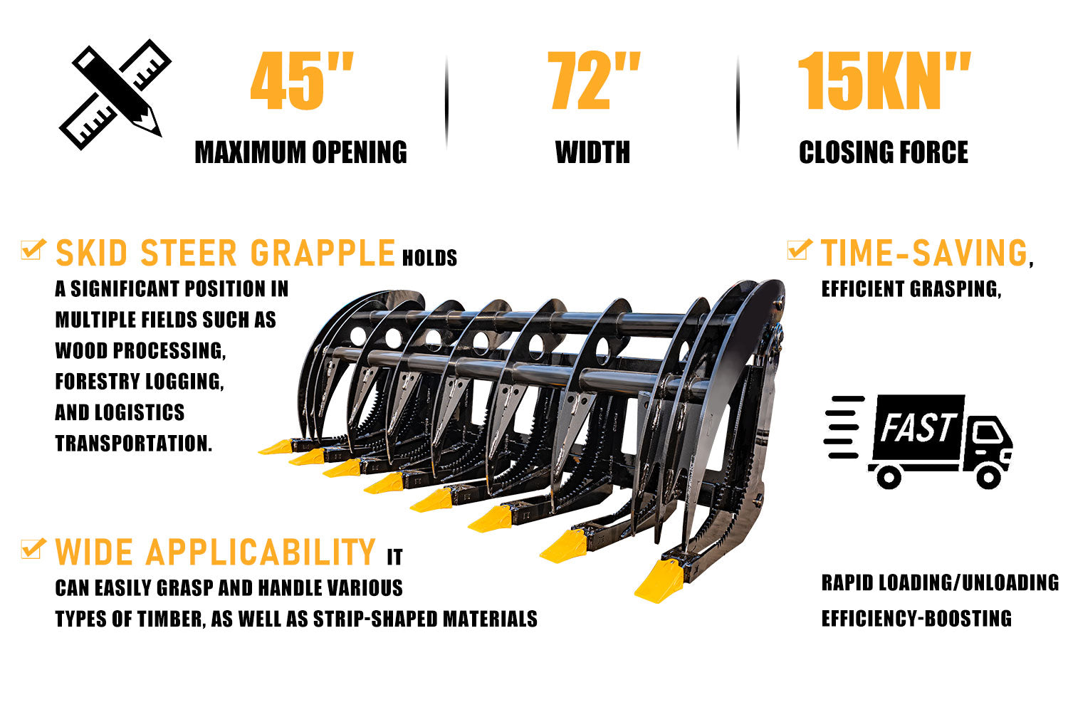 - MMS skid steer grapple attachment, with a capacity of up to 3300 lbs., is suitable for many fields, such as wood processing and forestry harvesting.