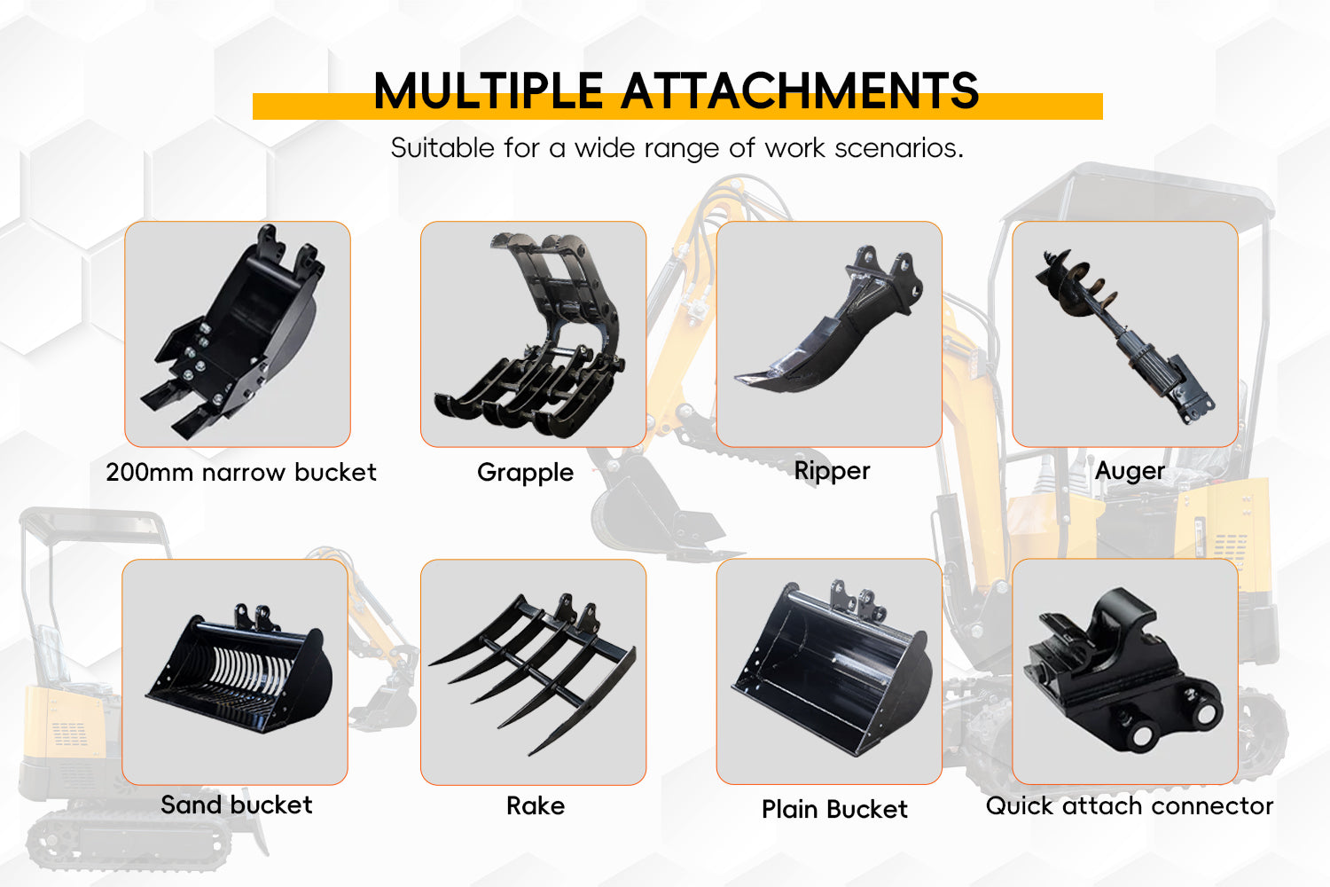 Durable Attachments: Compatible with most compact excavators and skid steer loaders.